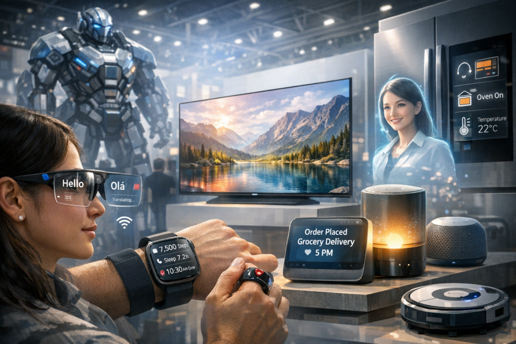 Mas o evento vai além dos robôs grandes e impressionantes. Quase todos os dispositivos de consumo — de TVs ultrafinas a aparelhos domésticos inteligentes — agora chegam com IA nativa que interpreta contexto, aprende com o usuário e atua sem necessidade de intervenção humana constante. Smart glasses com tradução em tempo real, wearables que ajustam seu comportamento conforme sua rotina e assistentes domésticos que organizam compras ou controlam eletrodomésticos mostram que a IA integrada já não é opcional — é padrão.